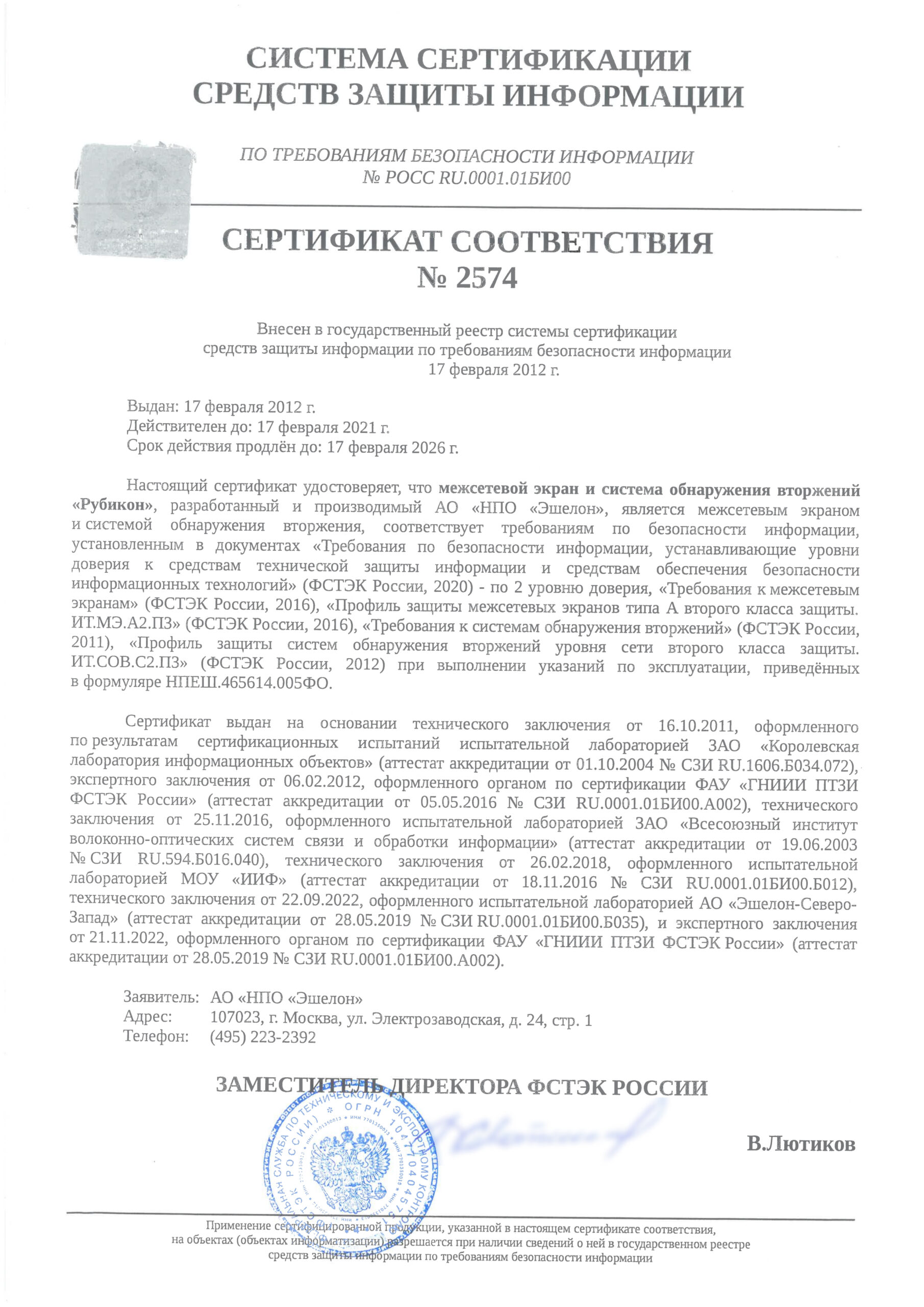 Срок действия сертификата соответствия ФСТЭК России № 2574 действителен до 17 февраля 2026 г. 🛈