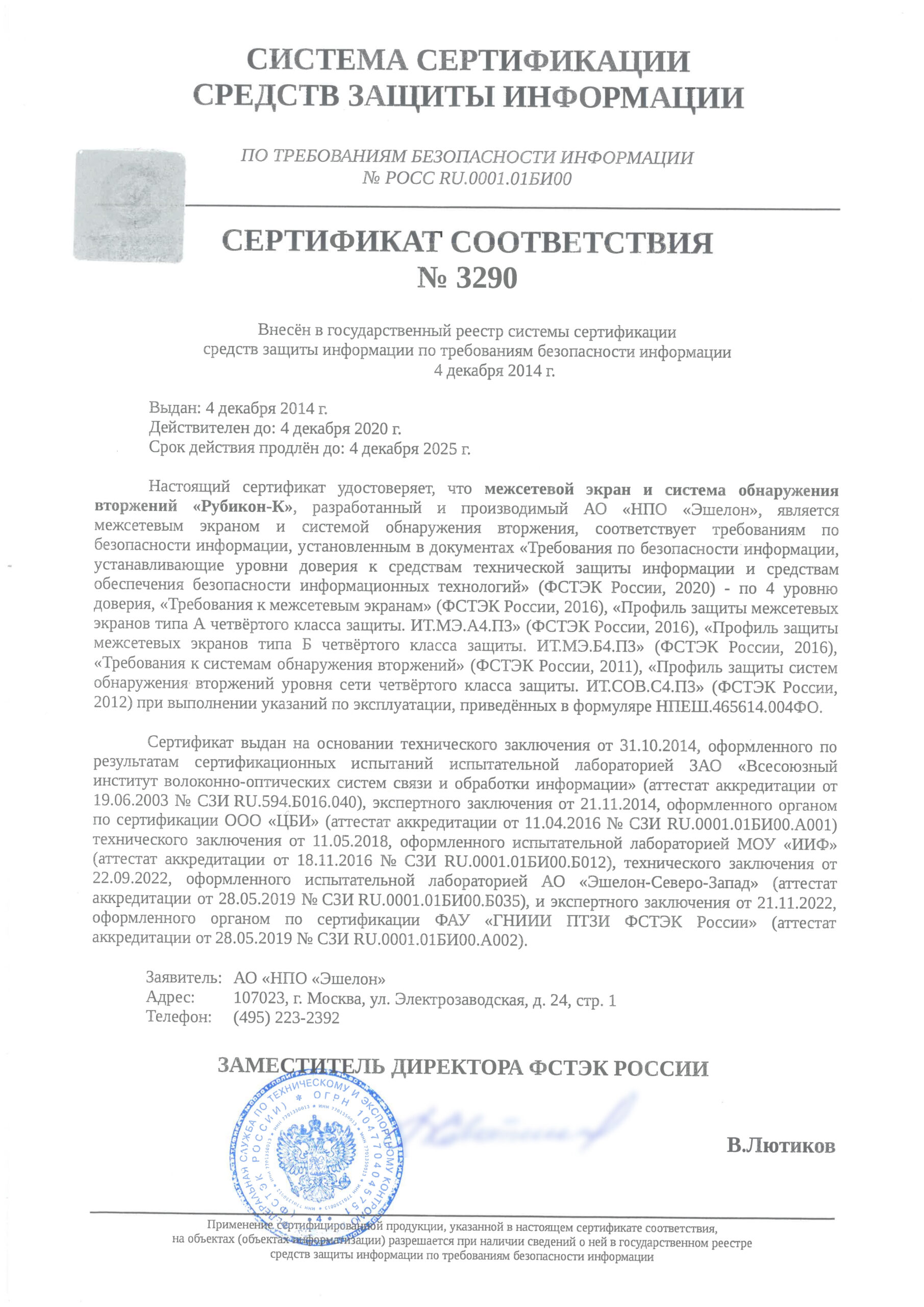 Срок действия сертификата соответствия ФСТЭК России № 3290 действителен до 4 декабря 2025 г. 🛈